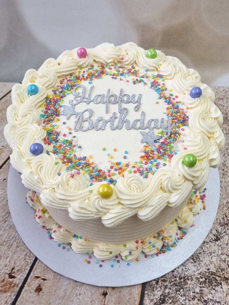 Three layers of delicious moist sponge in various flavours, filled and coated with velvety whipped buttercream, decorated with buttercream swirls, sugar pearls, rainbow star mix, and personalised cake topper message.