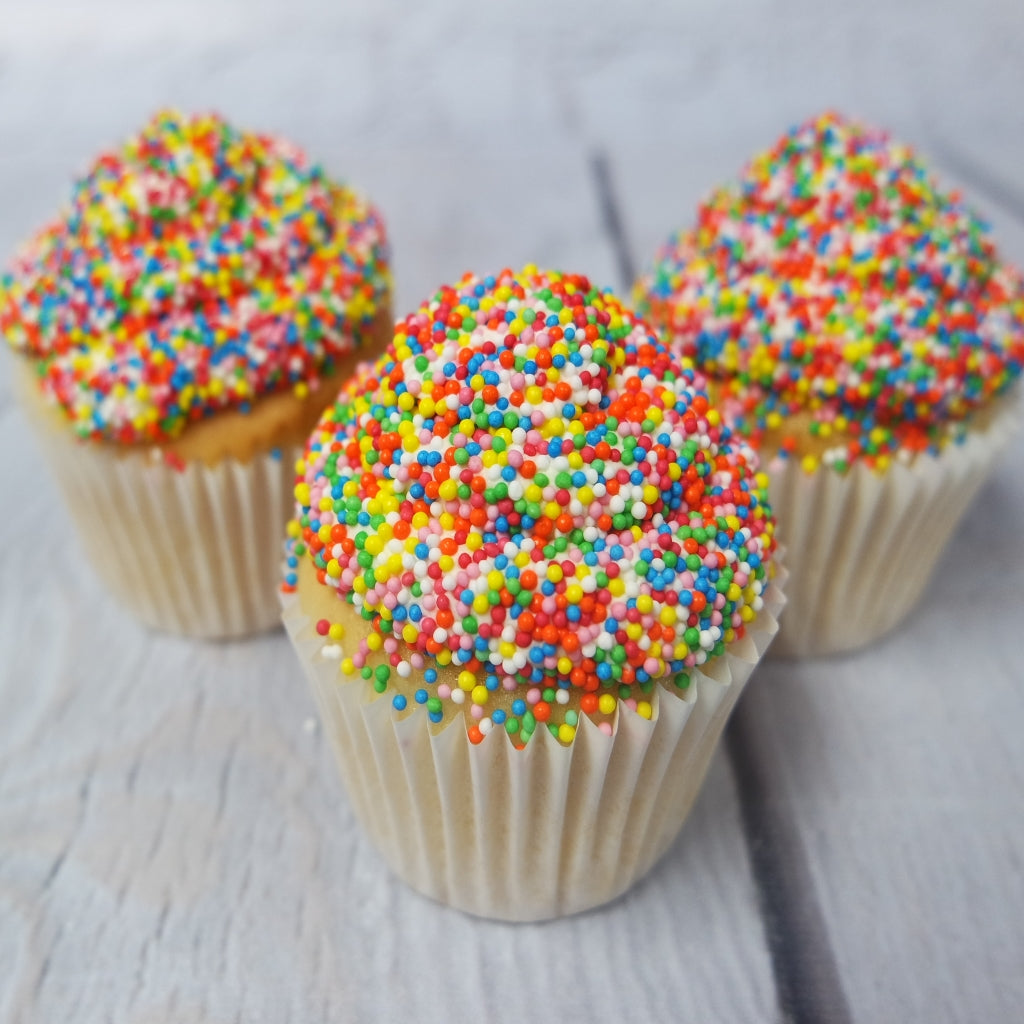 Moist cupcakes in a choice of flavours with appropriately flavoured whipped buttercream. Decorated with just hundreds and thousands of Hundreds & Thousands - but we haven't counted them! Packaged in a clear topped white cardboard box where you can send your own hand-written personalised message on a vintage gift tag.