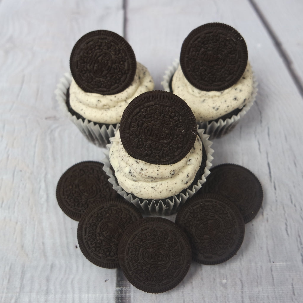 Moist chocolate sponge cupcakes with crushed Oreo cookie flavoured whipped buttercream. Decorated with a whole Oreo cookie. Packaged in a clear topped white cardboard box where you can send your own hand-written personalised message on a vintage gift tag.