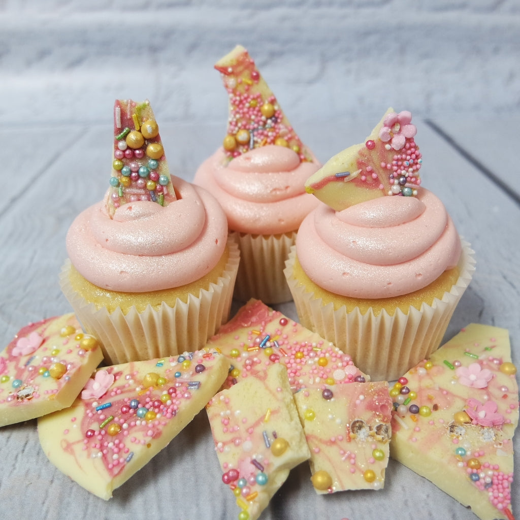 Moist cupcakes in a choice of flavours with strawberry syrup flavoured whipped buttercream. Decorated with white chocolate shards laced with pearls and petals. Packaged in a clear topped white cardboard box where you can send your own hand-written personalised message on a vintage gift tag.