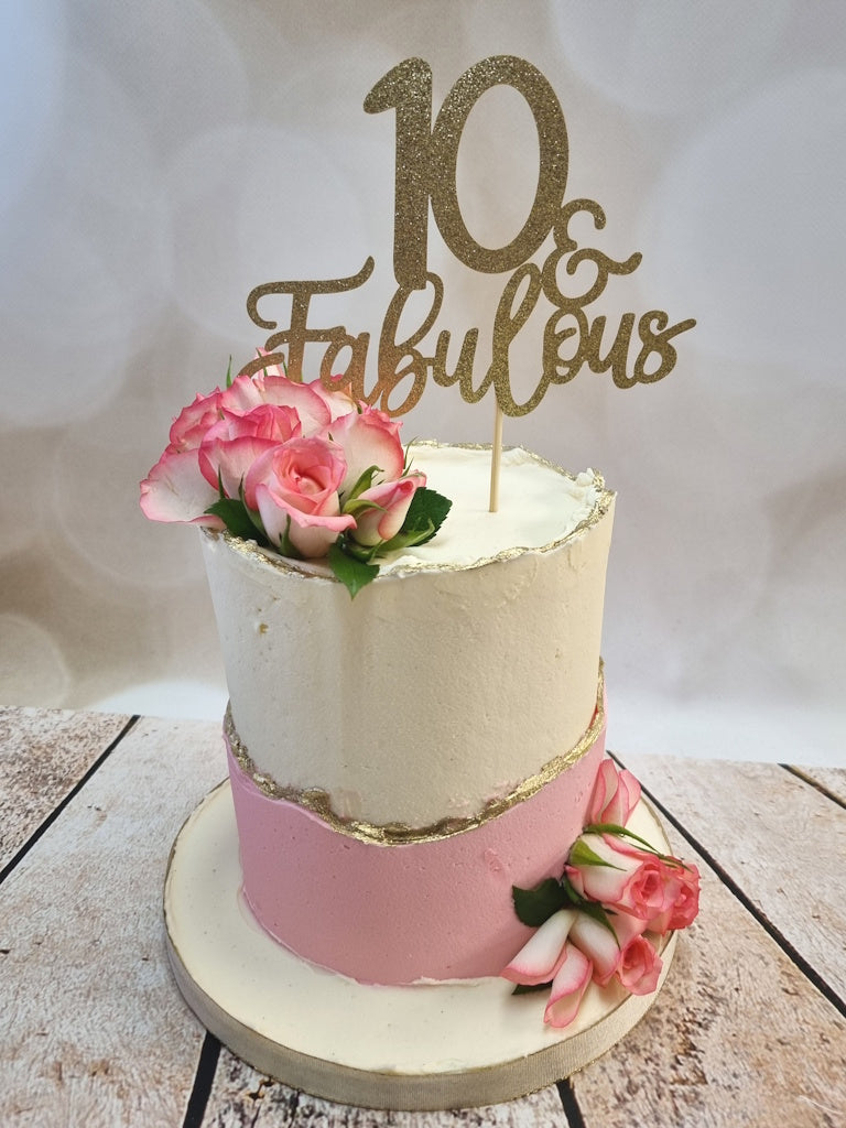 Five layers of delicious moist sponge in various flavours, filled and coated with velvety whipped buttercream, decorated with fresh flowers, and personalised gold glitter cake topper.