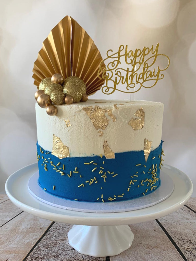 Three layers of delicious moist sponge in various flavours, filled and coated with velvety whipped buttercream, decorated with gold palm fan, gold bubbles, and gold glitter cake topper.