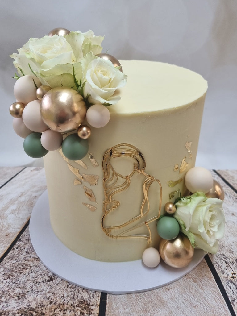 Five layers of delicious moist sponge in various flavours, filled and coated with velvety whipped buttercream, decorated with fresh flowers, gold, sage, and cream bubbles, gold leaf, and an acrylic expectant mother gold motif.