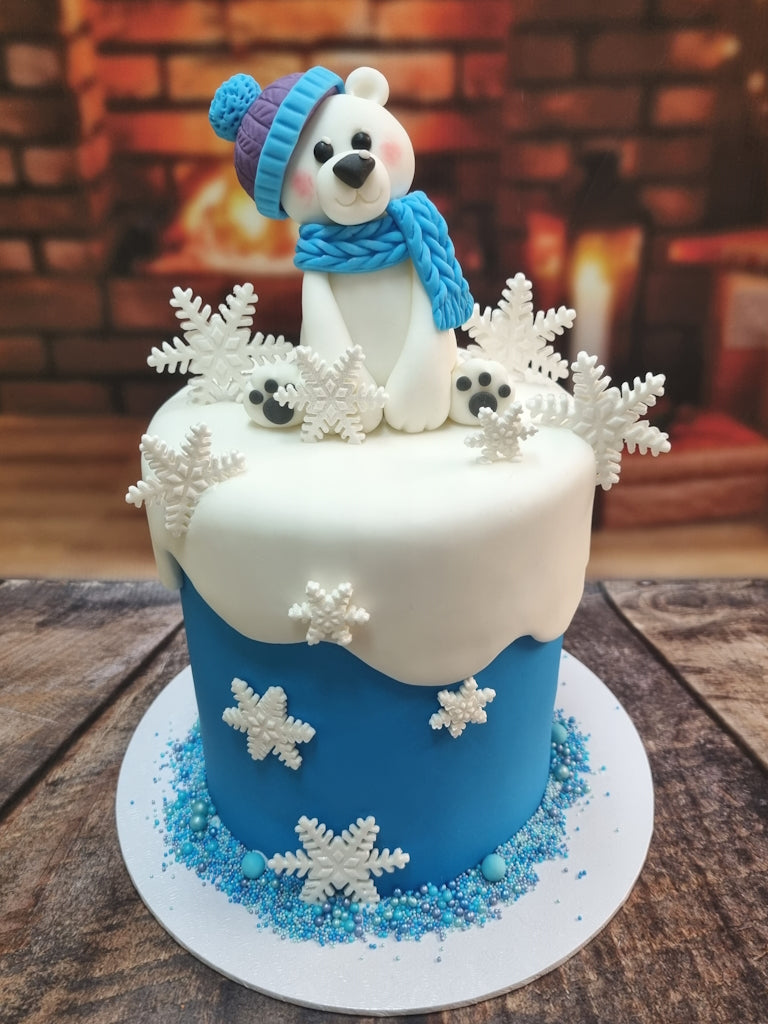 Christmas Polar Bear & Snowflakes Cake – 4 layers of delicious moist sponge in various sizes and flavours, filled and coated with chocolate flavoured velvety whipped buttercream. You choose your size and flavour of cake.